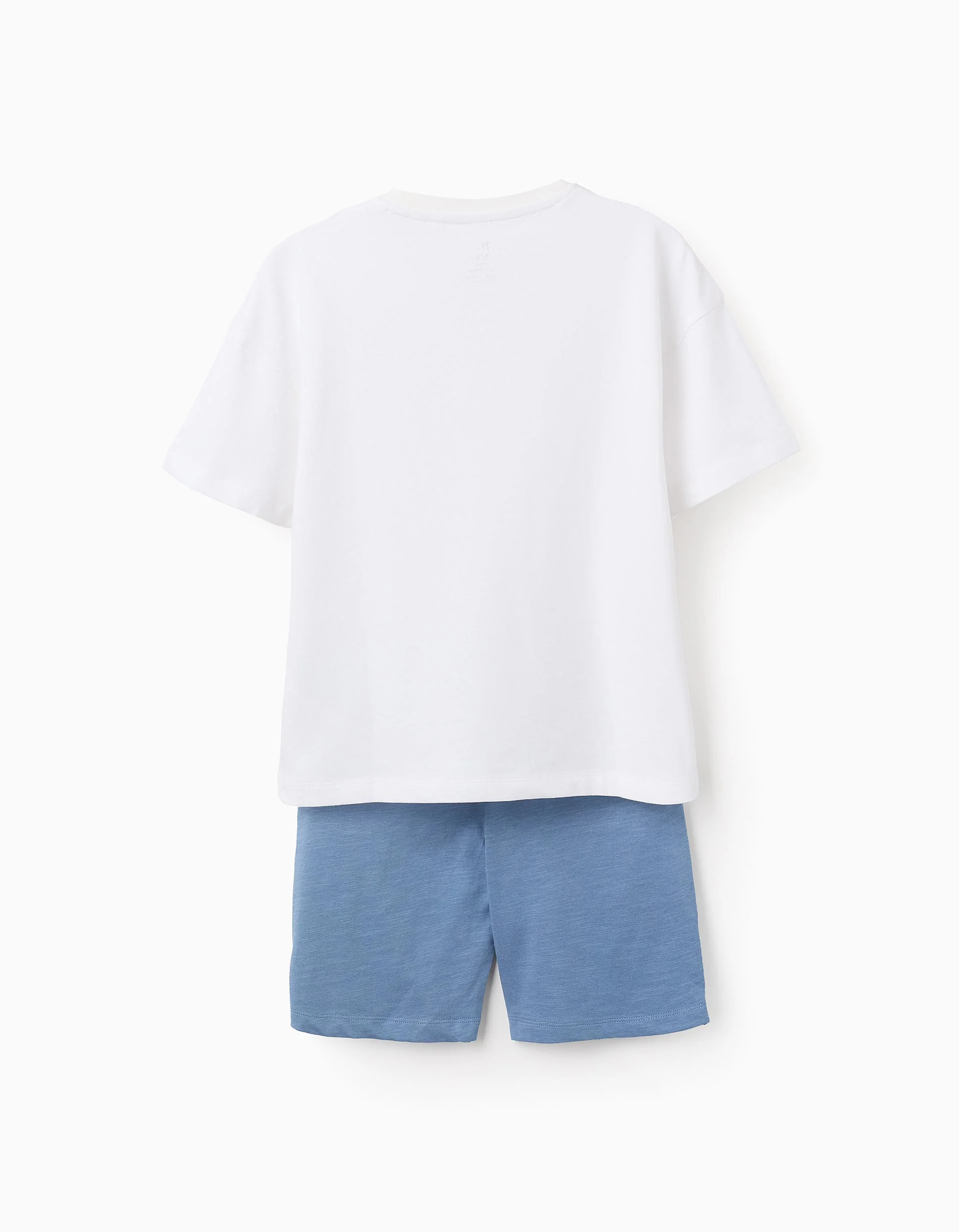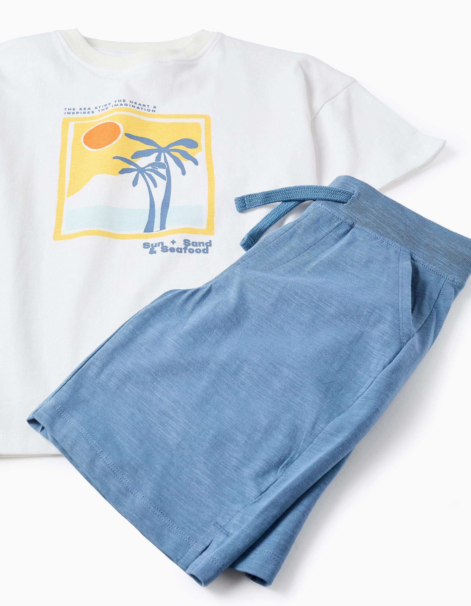 T-shirt + Short en Coton Garçon ‘Sun & Sand’, Blanc/Bleu