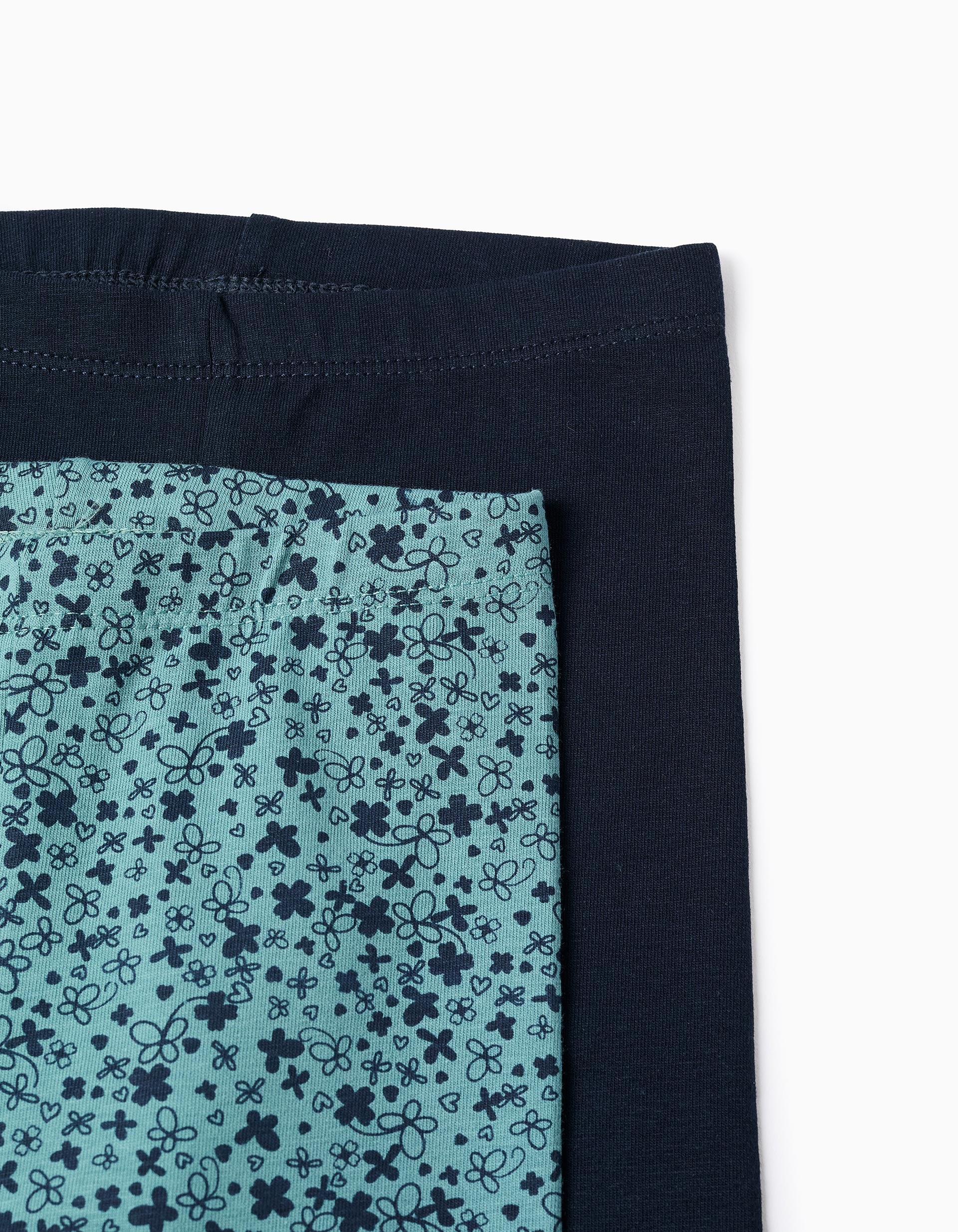 Lot de 2 leggings fleuris/lisses pour bébé fille, vert/bleu