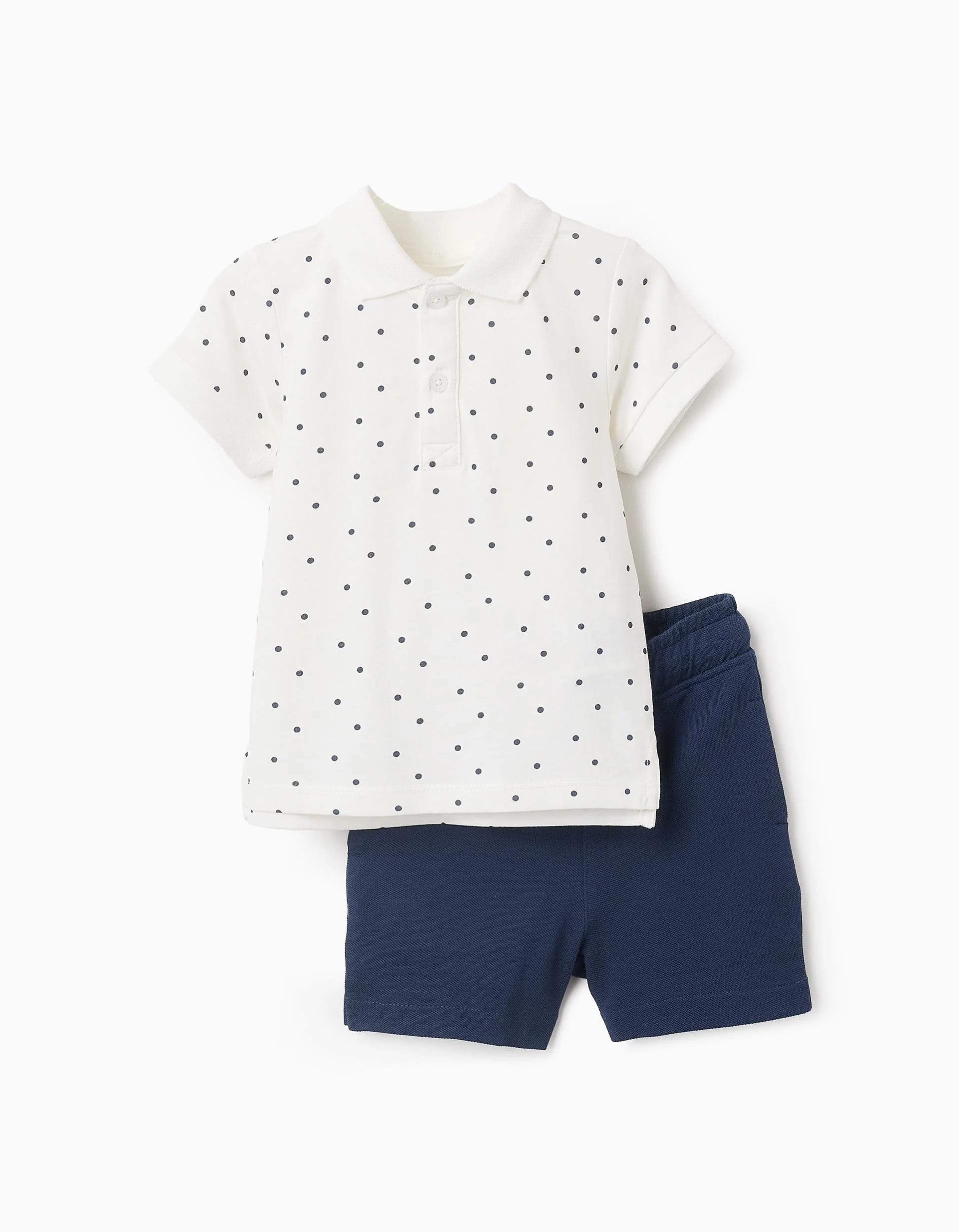 Polo + short à pois bébé garçon, blanc/bleu marine