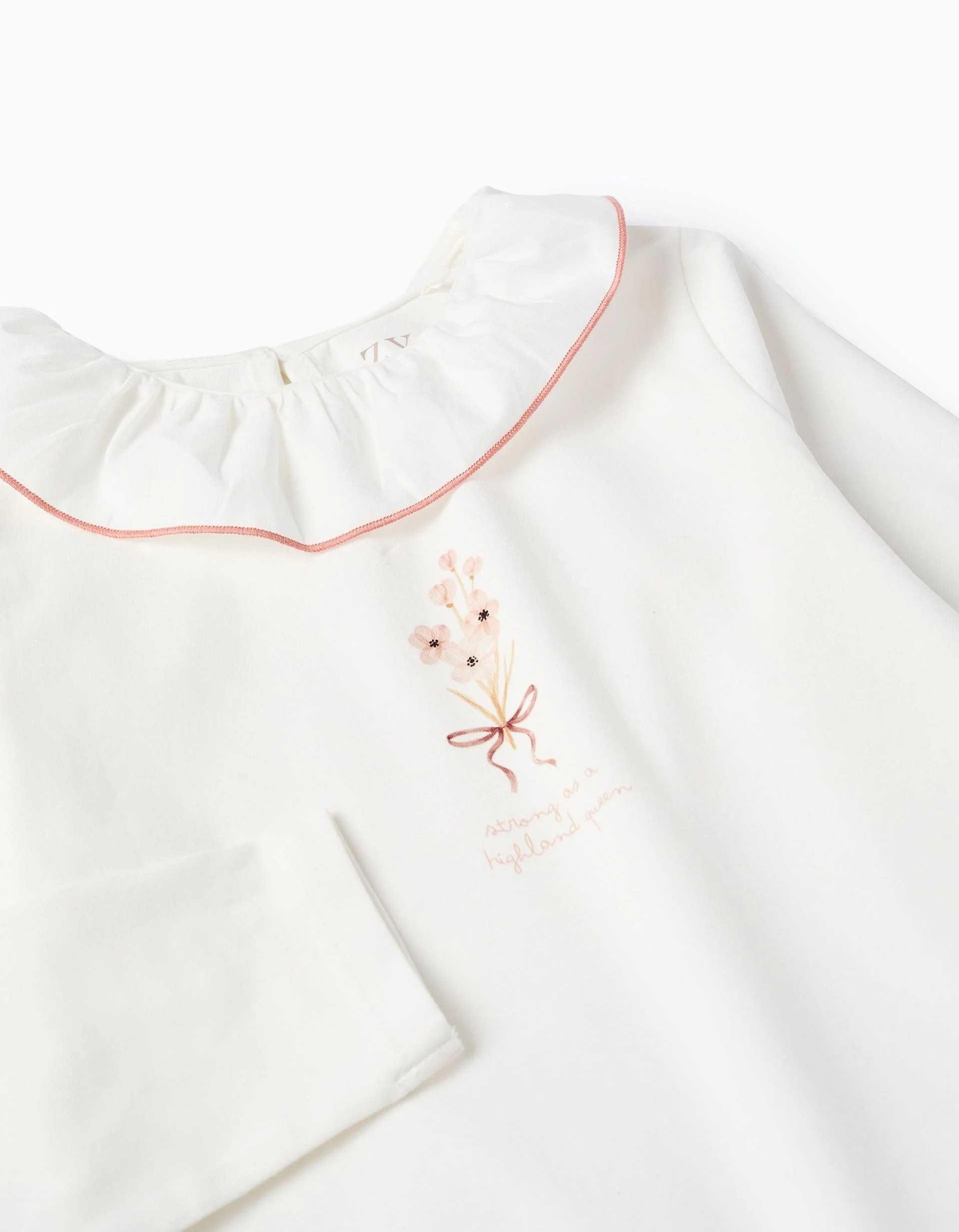 T-shirt à manches longues avec imprimé et col à volants pour filles, blanc