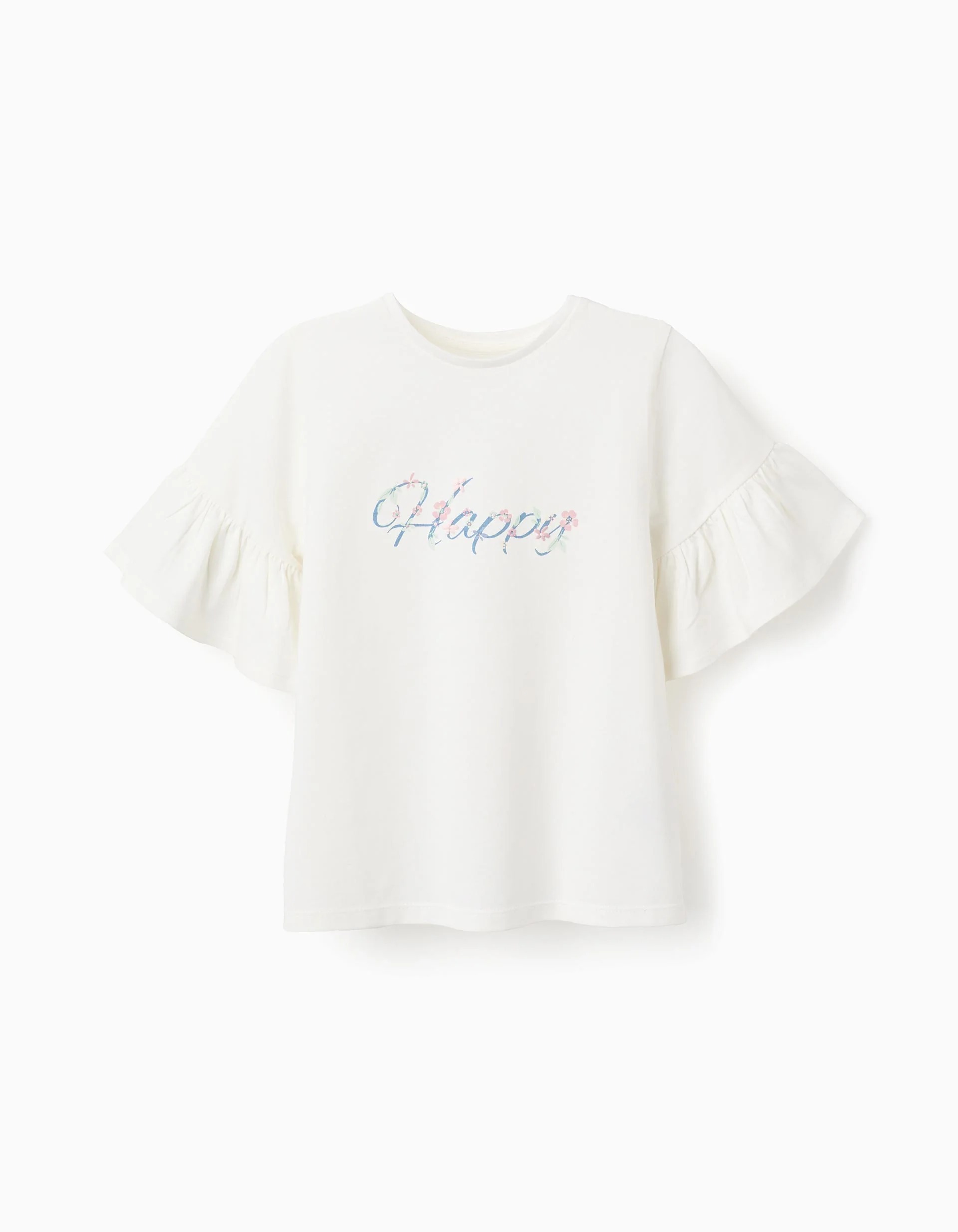 T-shirt en coton à manches volantées pour fille « Happy », blanc