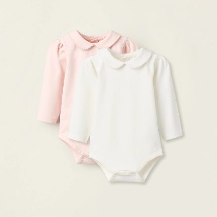 Pack of 2 Bodysuits in Cotton for Newborn Girls, White/Pink